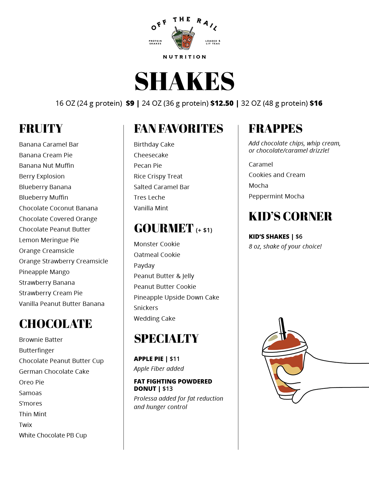 We offer three different sizes of protein shakes, including kid's!
